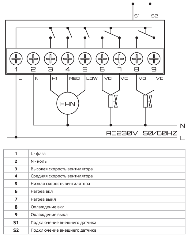 | A8 | Выбор используемого датчика | N1: внутренний датчик N2: внешний датчик N3: внутренний + внешний датчик Внешний датчик идёт в комплекте, подключается к двум черным проводам) Примечание: при выборе параметра «3» в режиме обогрева открывается только клапан, а вентилятор включается, только когда внешняя температура ≥ X °C. (задается в Расширенных настройках А9) Когда внешняя температура X-2 °C, вентилятор выключается. | N1 |