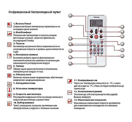 Удобная интеллектуальная панель управления встроена в консольный кондиционер Toshiba. Основные функции (включение, изменение температуры, выбор режима и направления воздушного потока) без труда включаются и отображаются на ЖК-дисплее. Активные функции изображаются цветными значками на дисплее. Дополнительные функции для Вашего комфорта: · Защита от детей · Изменение яркости дисплея · Автоматический перезапуск